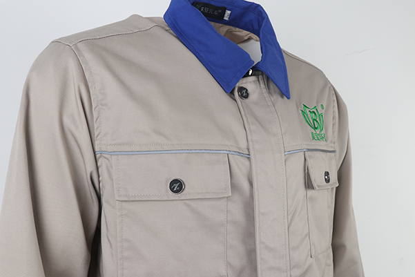 這次的工作裝,采用了百分之六十五的滌綸加百分之三十五的棉,考慮到工作環境這樣的布料耐磨,吸水性好,干得快,同時性價比也是非常高,顏色采用簡潔的淺咖色,領口處采用深藍色,款式上還是傳統的工裝款式,不同的是整體的顏色搭配和款式上看起來是非常休閑時尚的,另外在胸口處也是印制了刺繡logo,不容易掉色,這次樣衣展示給了企業,同時也是獲得了肯定。