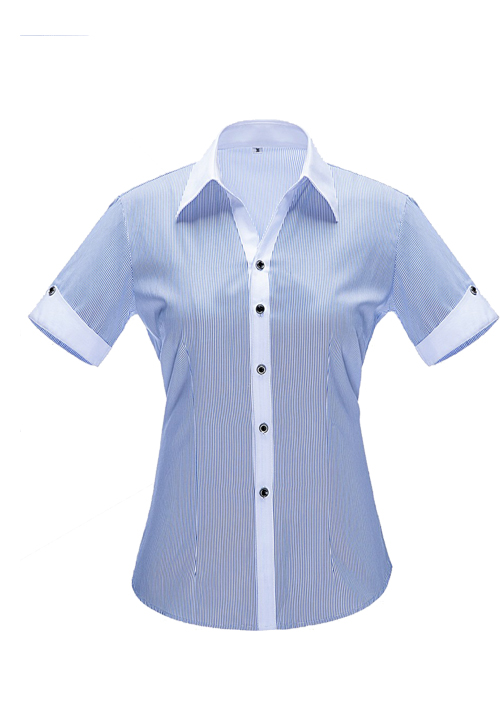 品名:女短袖v領襯衣;版型:修身版;貨號:YWD3501 ;面料:Y3501;顏色:藍色細條紋 ;Fabric:C35/T65